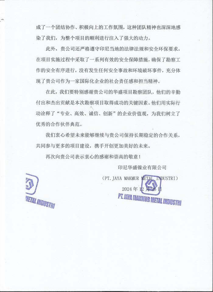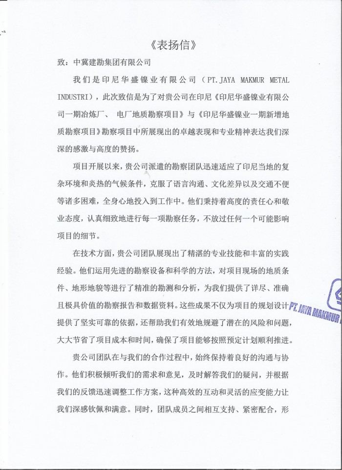 印尼華盛鎳業(yè)有限公司發(fā)來了表揚信。在印尼華盛鎳業(yè)有限公司一期冶煉廠、電廠地質(zhì)勘察項目及印尼華盛-年產(chǎn)200萬噸綜合鋼鐵項目的勘察任務(wù)中,印尼華盛勘察項目部全體職工迅速適應(yīng)印尼當(dāng)?shù)氐膹?fù)雜環(huán)境和炎熱的氣候條件,克服了語言溝通、文化差異以及交通不便等諸多困難,全身心地投入到工作中。在項目實施過程中,嚴(yán)格遵守印尼當(dāng)?shù)氐姆煞ㄒ?guī)和安全環(huán)保要求,采取了一系列有效的安全保障措施,確保了勘察工作的安全有序進(jìn)行。這種高度的專業(yè)素養(yǎng)和社會責(zé)任感,贏得了業(yè)主方的高度贊揚和深深感激。