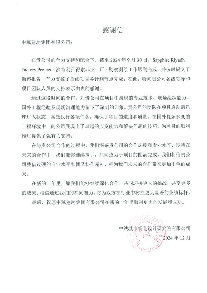 中鐵城市規(guī)劃設(shè)計研究院有限公司發(fā)來表揚信,對在我公司全力支持和配合下,順利完成沙特利亞德索菲亞工廠勘察測繪工作,并按時提交了勘察報告,有力支撐了后續(xù)項目各計劃節(jié)點完成,向我公司及項目團(tuán)隊表示由衷感謝。