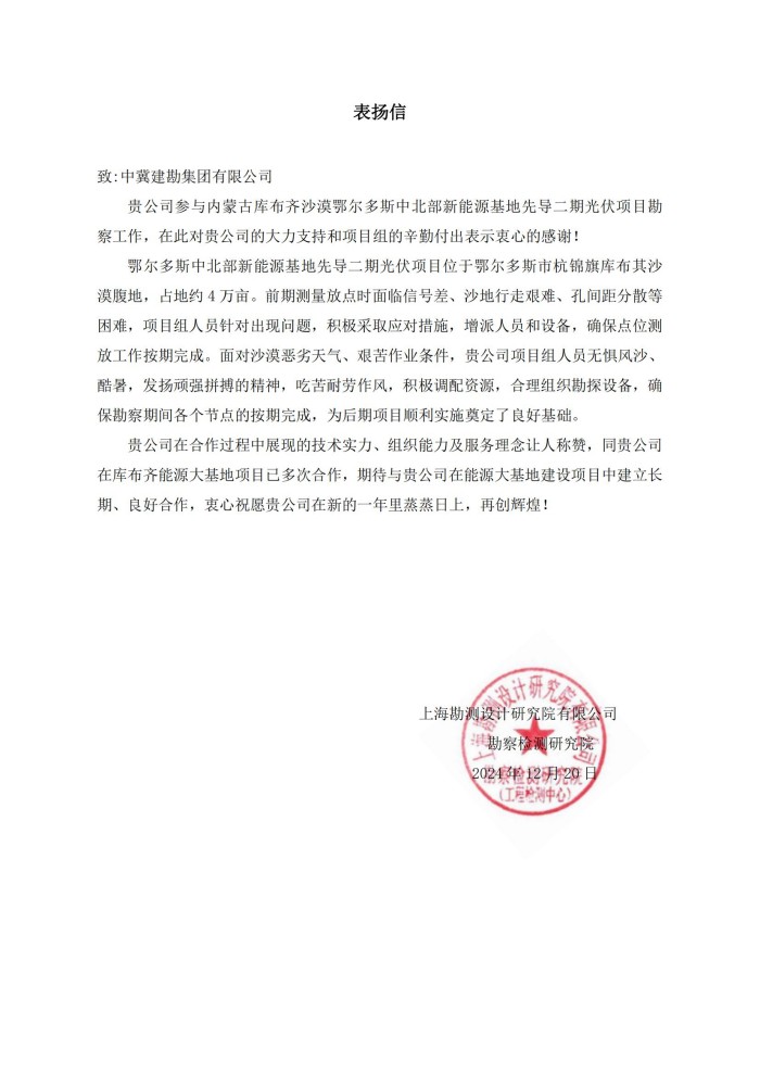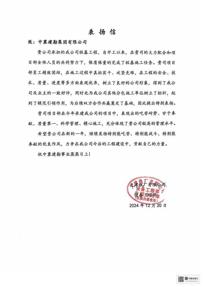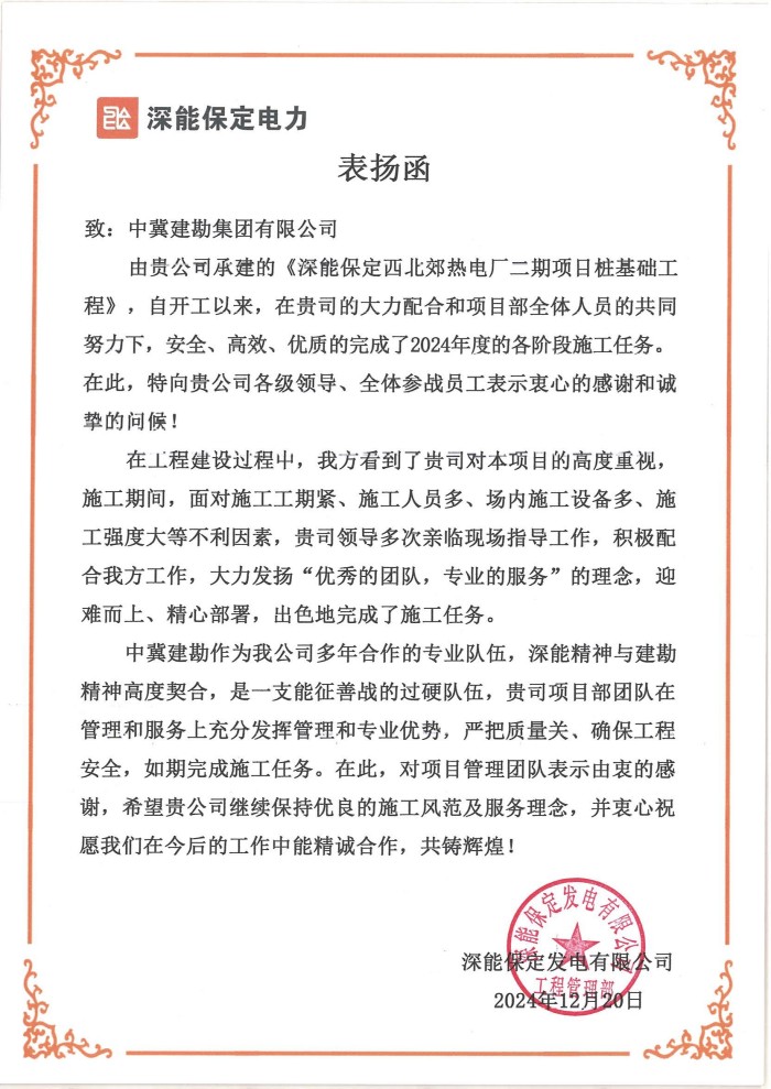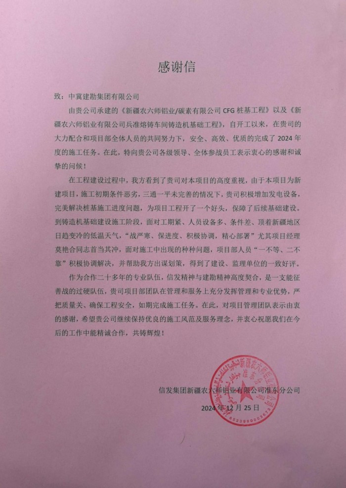 此外,我公司參與的新疆農(nóng)六師鋁業(yè)CFG樁項目、內(nèi)蒙古庫布齊沙漠鄂爾多斯中北部新能源基地光伏項目、深能保定西北郊熱電廠樁基礎(chǔ)工程等多個國內(nèi)外項目收到業(yè)主單位表揚信,對我公司在項目中的高效執(zhí)行、嚴(yán)謹(jǐn)管理和出色的團(tuán)隊協(xié)作表示衷心感謝,并希望未來繼續(xù)與我公司保持緊密合作。