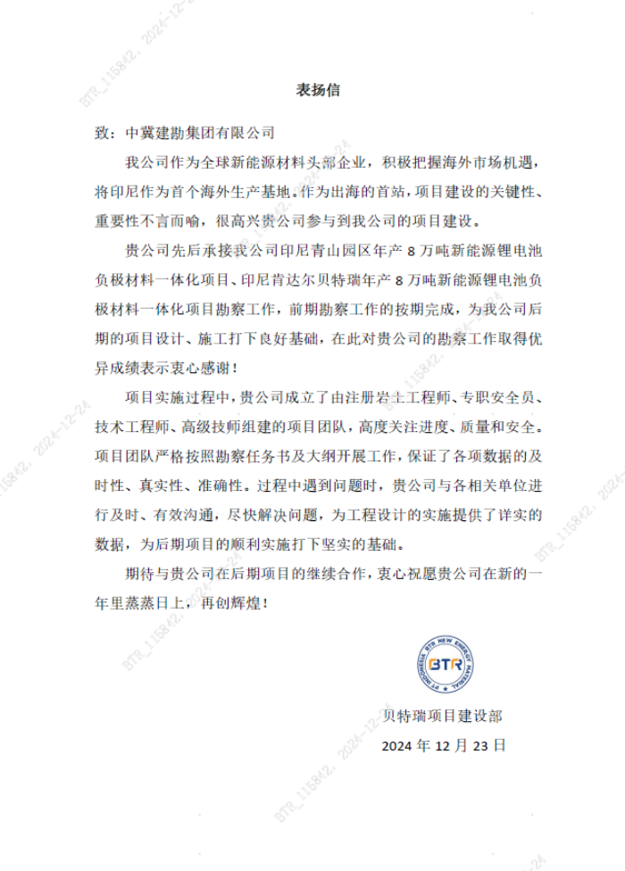 近日,公司收到了來自多方業(yè)主單位的感謝信及表揚信,表彰公司在孟加拉、印尼、沙特及國內(nèi)多個重要項目中,展現(xiàn)出的卓越項目管理能力、技術(shù)實力、團(tuán)隊協(xié)作及不懈努力。各業(yè)主單位對公司在工程勘察、施工管理、技術(shù)方案執(zhí)行、質(zhì)量控制和安全生產(chǎn)等方面給予了較高認(rèn)可,并送上了誠摯的祝福。