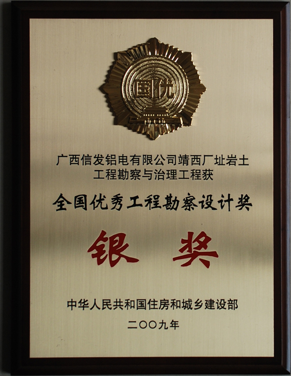 2010年7月6日,住房和城鄉(xiāng)建設(shè)部在北京召開2008年度全國(guó)優(yōu)秀工程勘察設(shè)計(jì)獎(jiǎng)?lì)C獎(jiǎng)大會(huì),我公司“廣西信發(fā)鋁電有限公司靖西廠址巖土工程勘察與治理”項(xiàng)目被授予全國(guó)優(yōu)秀工程勘察設(shè)計(jì)銀獎(jiǎng)獎(jiǎng)牌。