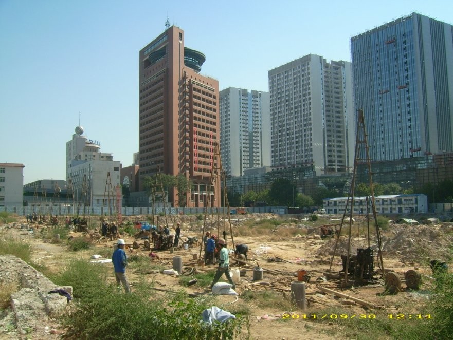 擬建場地基巖面起伏較大,巖溶地質(zhì)條件復(fù)雜,基巖內(nèi)溶洞、裂隙發(fā)育。溶洞最大高度為9.7m,對勘察揭露的空洞、半充填溶洞及破碎帶采用先充填粗骨料后注漿治理方法;對嵌巖樁采用“一樁一探、探治結(jié)合”;根據(jù)巖溶治理方案專家論證評審意見,對對原古采煤巷道采用鉆探與物探相結(jié)合的方法。利用鉆探孔直接在巷道平面位置及周邊進(jìn)行巷道探查,利用井下電視、井間CT、淺層地震和瞬變電磁物探手段進(jìn)行驗證,同時對遠(yuǎn)年采空區(qū)進(jìn)行了探查驗證并進(jìn)行了治理。2012年4月22日,專家評審驗收意見為:提供的巖溶地基治理竣工資料齊全、內(nèi)容較全面,滿足巖溶地基治理工程竣工驗收評審要求;檢測單位采用了鉆探及面波等檢測方法可靠;巖溶地基治理效果達(dá)到了設(shè)計要求,同意通過竣工驗收評審。