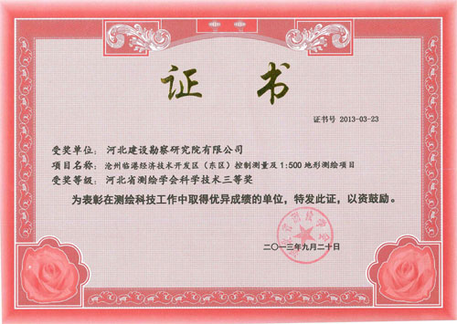 近日,由工程測量公司完成的滄州臨港經(jīng)濟技術開發(fā)區(qū)(東區(qū))控制測量及1:500地形測繪項目,被河北省測繪學會評為河北省測繪學會科學技術三等獎。